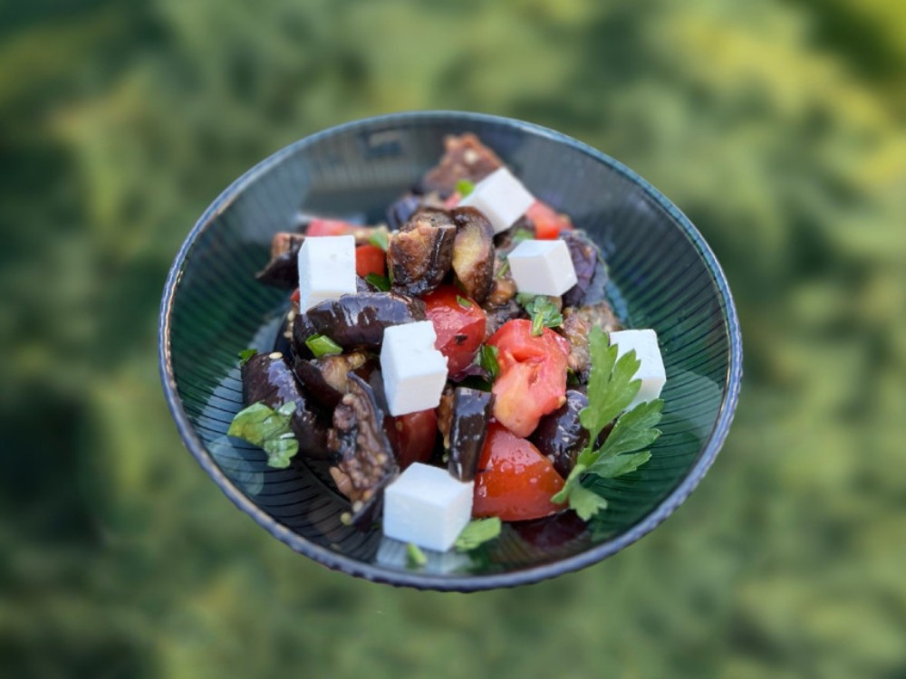 Салат з печеним баклажаном, помідором та сиром фетою 1/250