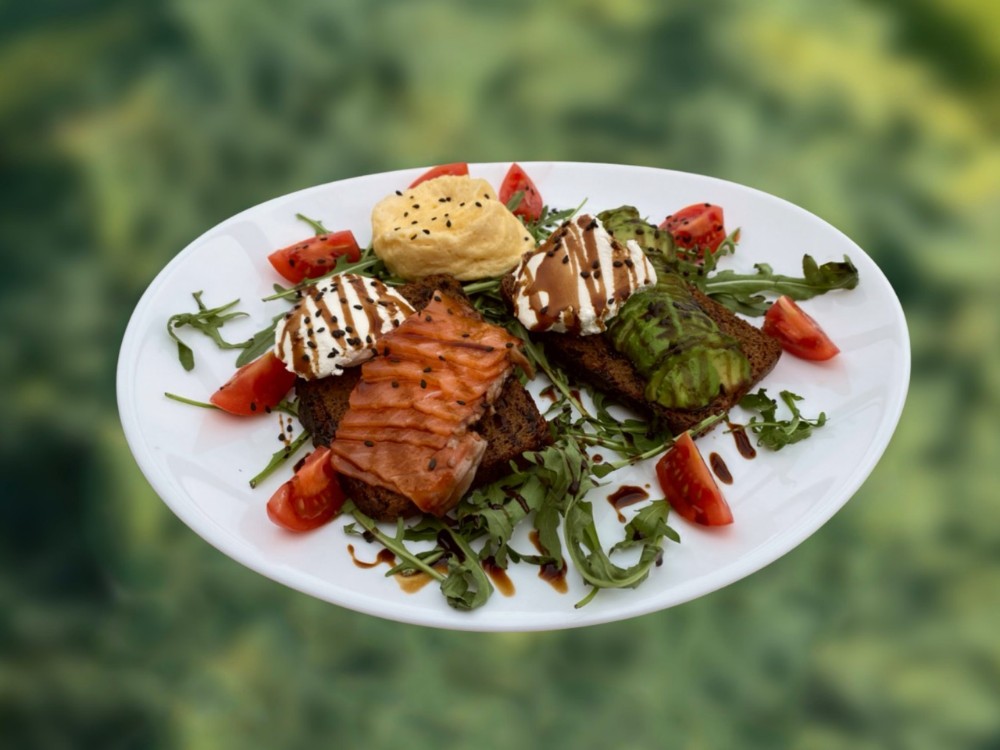 Брускета з червоною рибою, авокадо та яйцем омлет