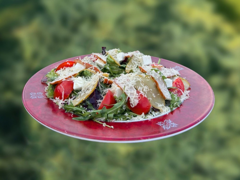 Салат з качиною грудкою, карам. грушею під малиновим соусом 1/300